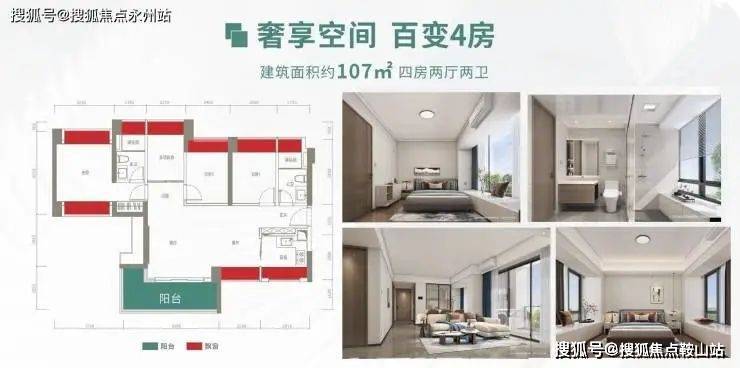 107㎡四房两卫(1栋1/2/3单元01/06户型)竖厅南北通透格局,餐客一体,动静分区结构,L型阳台,3房+1多功能房,户型使用率高,但进门即是公卫,有点不太好,01户型东南朝向,06户型西南朝向