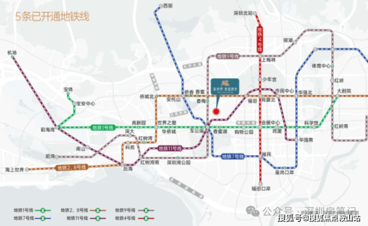 双地铁口,1号线香蜜湖站步行约500米,9号线香梅站步行约640米。在这两个站点乘车1-2站可达车公庙、景田、购物公园、会展中心换乘站,便捷换乘2/8号-3号-4号-7号-11号线。1.5公里范围内有深南大道、香蜜湖路、新洲路等城市主干道,深南大道连接罗湖、福田、南山、前海核心区,自驾出行也非常方便。另外,项目步行1200米可达地铁五期在建的22号线香蜜西站。22号线誉为"科技金融大动脉",直连香蜜湖新金融中心与河套两大引擎。