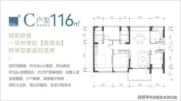 116㎡的4房2厅2卫,C户型,设计的是竖厅南北通透格局,餐客厅一体化设计,客厅3.8米开间,四开间朝南,4个卧室分别做到了主卧17.85㎡/次卧11.4㎡/次卧9.3㎡/次卧8㎡(包含墙体飘窗),都不用搭配飘窗做床,U型厨房,卫生间干湿分离,得房率约:93.13%(包含赠送),阳台主朝西南、东南或正南向。