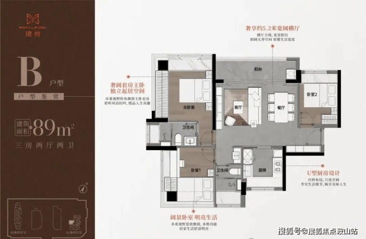B户型西北向仅29套,大横厅户型,5.2的客厅开间,双龙抱珠户型,使用率98%