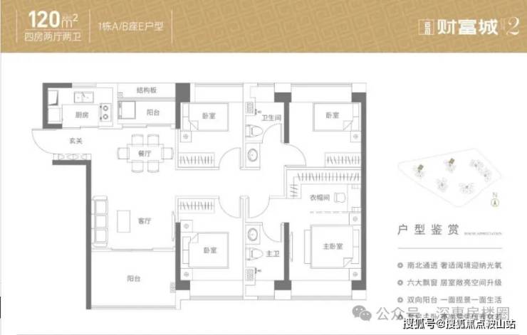 竖厅设计,南北通透格局,双阳台,客厅3.6米开间,4个卧室分别是3.2/3.2/2.75/2.75米的宽度,U型厨房,含赠送得房率约88.36%,阳台朝东南、西北、东北向。