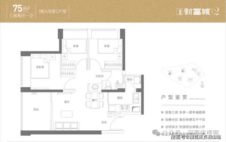 竖厅格局,客厅3.05米开间,3个卧室分别是3.1/2.85/2.25米的宽度,L型厨房,带1个小生活阳台,含赠送得房率约91.52%,西南及西北朝向。