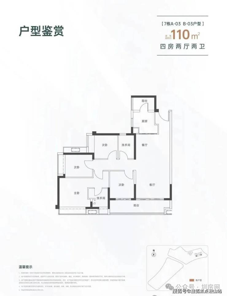 110㎡的4房2厅2卫,设计的是经典竖厅格局,进门入户玄关,客厅3.6米开间,LDKB一体化设计,四开间朝南,动静分区,4个卧室分别做到了主卧13.85㎡/次卧7.6㎡/次卧6.96㎡/次卧6.8㎡(实测面积,去掉墙体),客厅连接次卧出6.2米长(实测)的山景大阳台,L型厨房还带1个生活阳台,卫生间干湿分离,得房率约82%(不含赠送),东南朝向。
