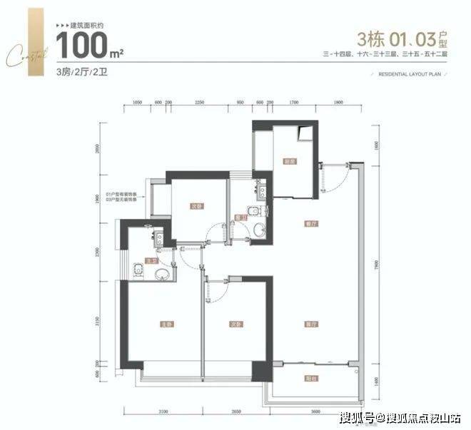 3栋:4梯6户,层高3.1米,01-04户型100平3房2卫,05-06户型120平4房2卫