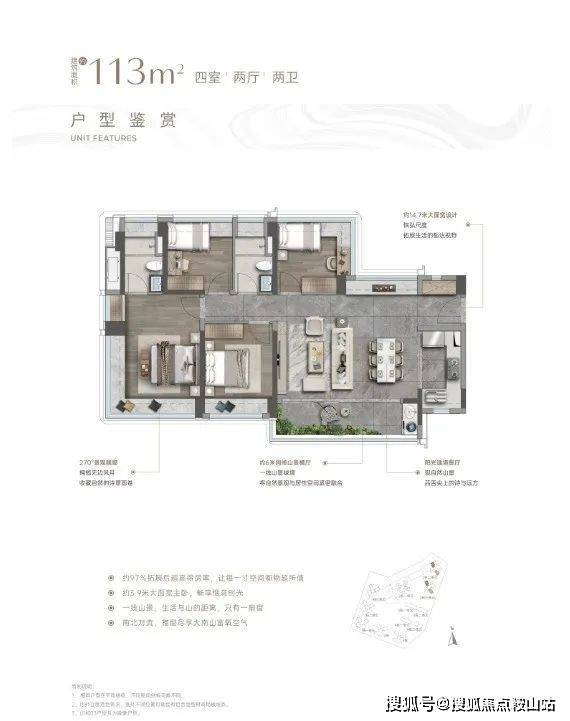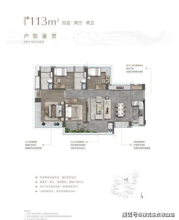 约113㎡的4房2卫,竖庭格局,西南向,基本居住功能与建面约108-110㎡4房2卫一致,但格局不一样,从目前公布的户型图上看,主要是主卧空间有了更大的提升,比如可以放更大一点的衣柜。但从位置上看,它所在的楼栋更靠近主干道,会有噪音影响。