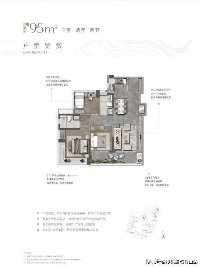 约95㎡的3房2卫,该户型为西南向(部分户型看海)或东北向看山景,是传统的竖庭格局,南北通透。最大亮点是,阳台从客厅对出连通到次卧,显得比较宽敞。特别是对于三代同堂的家庭,适合老人早期锻炼。