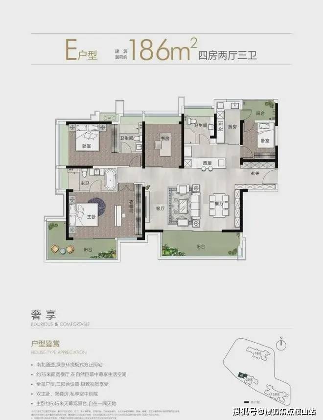 5. 186㎡户型,33套,大平层四房,豪华的居住体验,宽敞的客厅、独立的餐厅、精致的套房设计,尽显尊贵与舒适。
