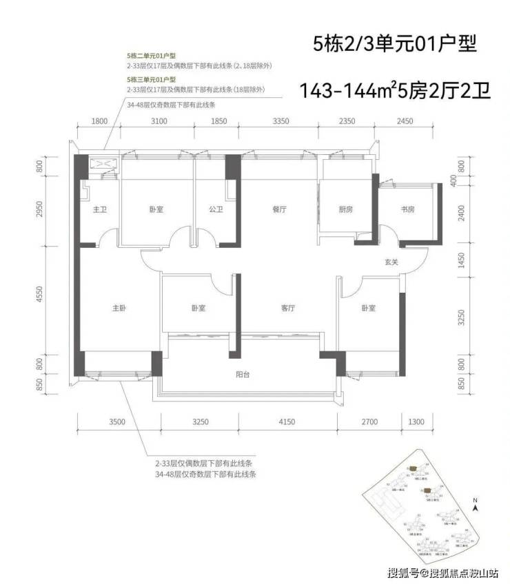 【五栋二单元-平面图】3梯4户,4条腿,01号房户型约144㎡的5房2厅2卫,02、03号房户型约96㎡的3房2厅2卫,04号房户型约115㎡的4房2厅2卫。