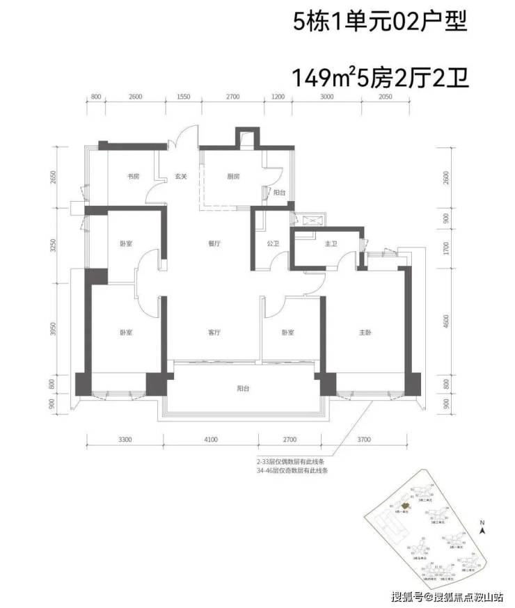【五栋一单元-平面图】3梯3户,3条腿,分别是01、03号房户型约173㎡的5房2厅2卫、02号房户型约149㎡的5房2厅2卫
