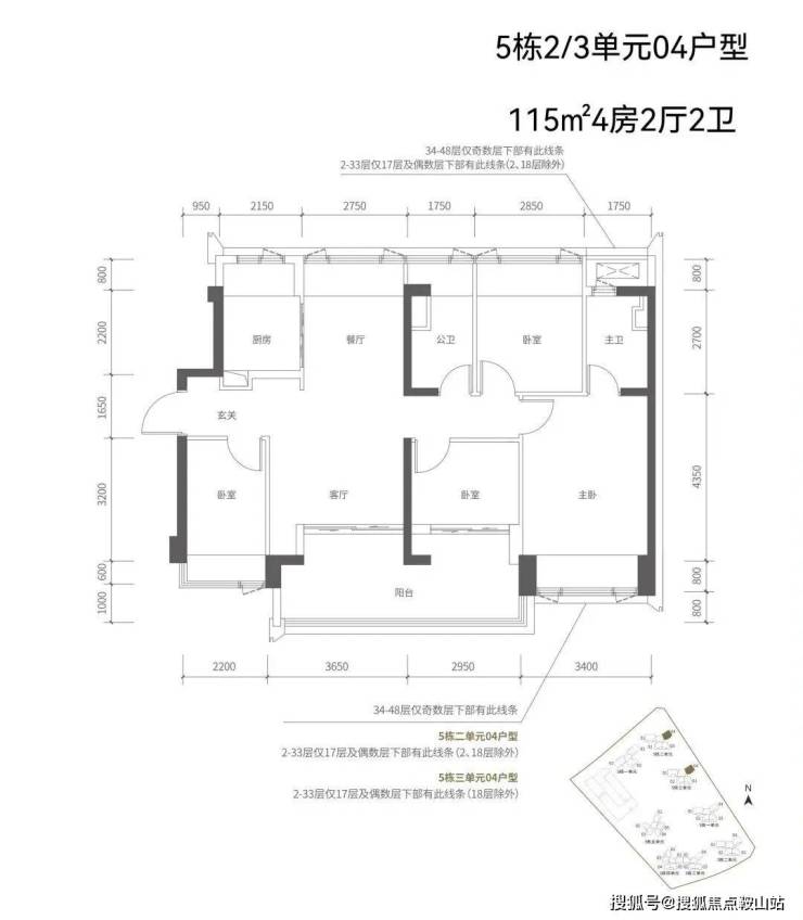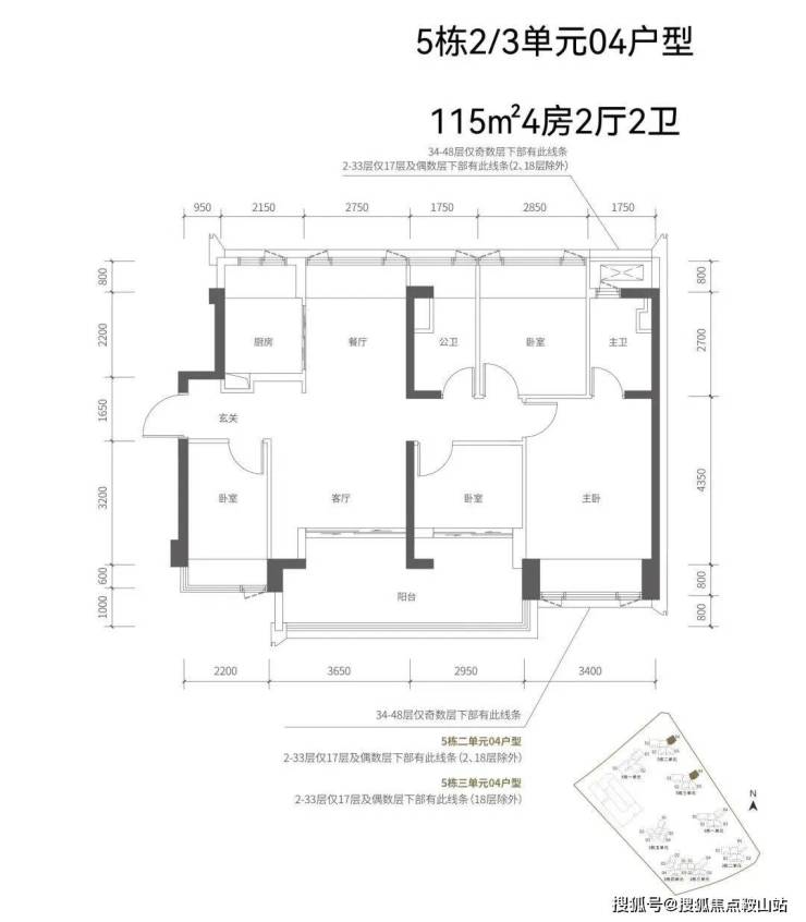 【五栋三单元-平面图】3梯4户,4条腿,跟二单元的户型产品一模一样,01号房户型约144㎡的5房2厅2卫,02、03号房户型约96㎡的3房2厅2卫,04号房户型约115㎡的4房2厅2卫。