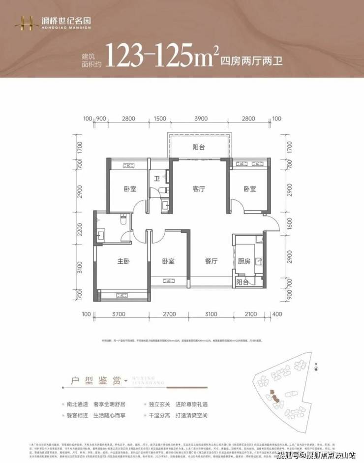 125㎡的4房2厅2卫:竖厅南北通透格局鸿桥世纪名园售楼处电话☎:400-150-5057,客厅3.9米开间,LDKB一体化设计,4个卧室分别做到了3.7米/2.8米/2.8米/2.7米的宽度,L型厨房带1个小生活阳台,公卫三段式分离,阳台主朝东北或东南向。