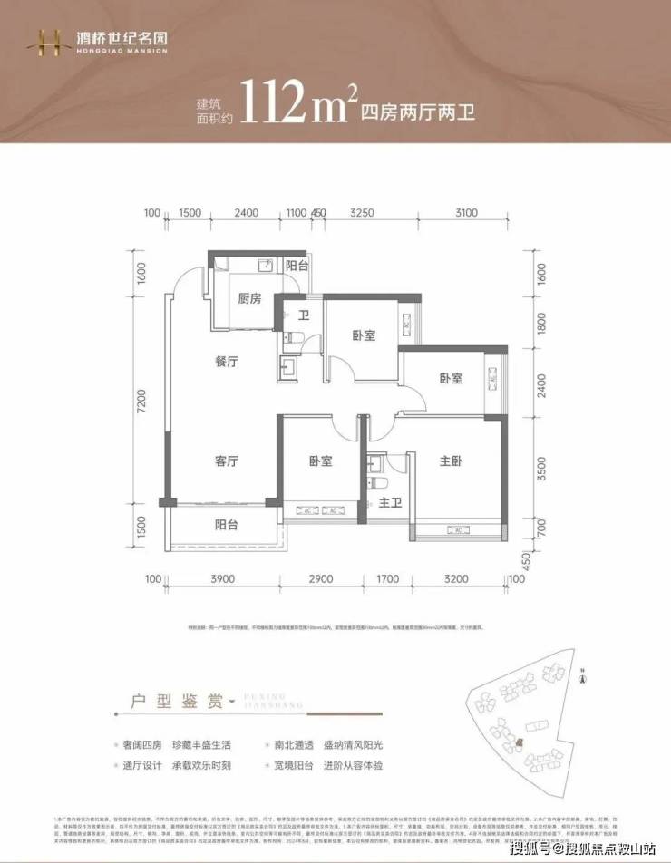 112㎡的4房2厅2卫:经典竖厅格局,鸿桥世纪名园售楼处电话☎:400-150-5057客厅3.9米开间,LDKB一体化设计,4个卧室分别做到了3.2米/2.9米/2.55米/2.4米的宽度,L型厨房带1个小生活阳台,公卫三段式分离,东南朝向。