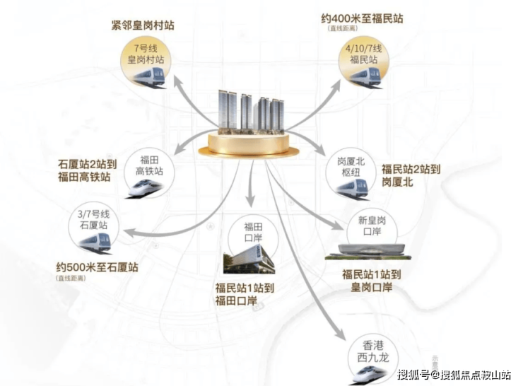 交通方面:地铁7号线 皇岗村站E/D口步行100米,4/10号线福民站300米,2站到皇岗口岸,多条公交线路直达口岸,跨境巴士无缝衔接香港。
