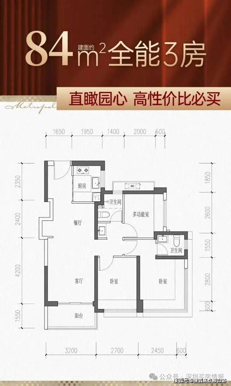 84㎡的3房2厅2卫,设计的是经典竖厅格局,客厅3.2米开间,LDKB一体化,S墙设计预留冰箱卡槽位,三开间朝南,3个卧室分别做到了主卧12.37㎡/次卧9.18㎡/次卧6.76㎡(包含墙体飘窗),U型厨房,卫生间三段式分离,得房率约77%(不含赠送),西南或东南朝向。