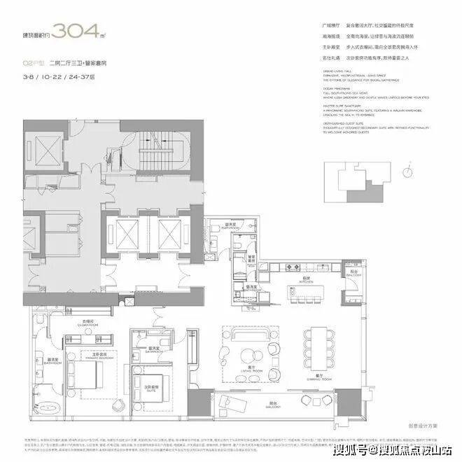 南北通透三面采光,顶奢总统套房规格,270°全景套房,享受湿地/公园/CBD景观,都是套房设计,更具私密性,中西厨分离。