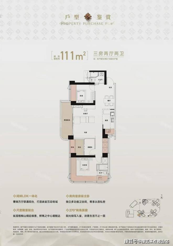 111㎡的3房2厅2卫,设计的是竖厅格局,LDK一体化设计,四开间朝南,主卧270°无柱转角全景舱,L型厨房,卫生间干湿分离,得房率约94%(包含赠送),西北朝向看一线梧桐山景观。
