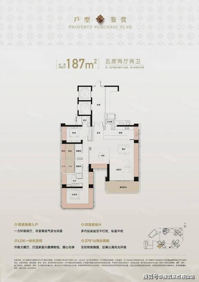 187㎡的5房2厅2卫,设计的是竖厅格局,尊享独立电梯入户,LDKB一体化设计,动静分区,三开间朝南,主卧270°无柱转角全景舱,L型厨房+岛台中西厨设计,公卫三段式干湿分离,得房率约111%(包含赠送),西南朝向看海景景观。