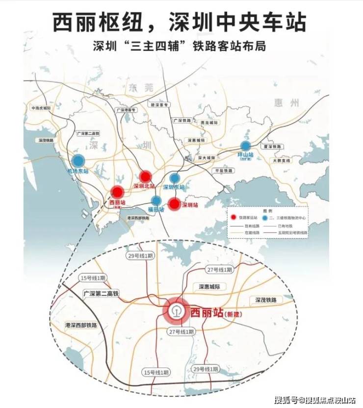 这里将引入赣深、深茂、深汕、深珠4条铁路。同时地铁13/15/27/29号线、深惠、深莞城际也将在此设站