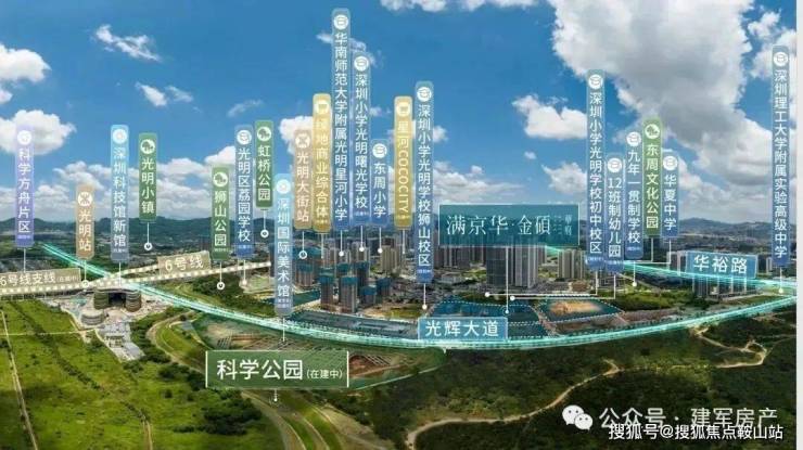 金硕臻府,由满京华集团开发,位于光明区光明中心区光辉大道与狮山三街交汇处,项目所在区域是光明规划最宜居,居住小区板块最大的片区,北侧靠近科学公园,东侧及南侧是深圳小学光明学校狮山校区及初中校区,距离最近的6号地铁线“光明站”约800米。