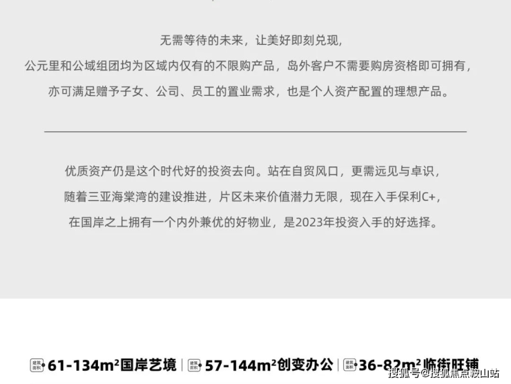 公域整体打造建面约57-144㎡全能创变空间,这是塔尖群体在海南自贸港三亚高能板块想拥有的轻资产,也是当下海棠湾市面中难觅的创变小户型。