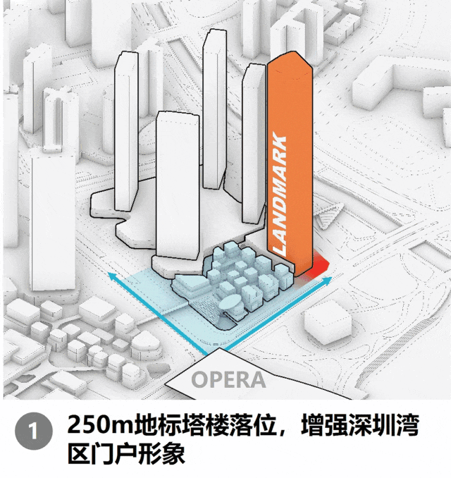 其一,打造高渗透的滨海空间。将高层塔楼后退,释放前排滨海地面空间,打造小尺度商业与文化街区,形成与歌剧院南北呼应的“泛演绎”式公共空间,东西贯通至蛇口山公园形成滨海活力景观商业带。