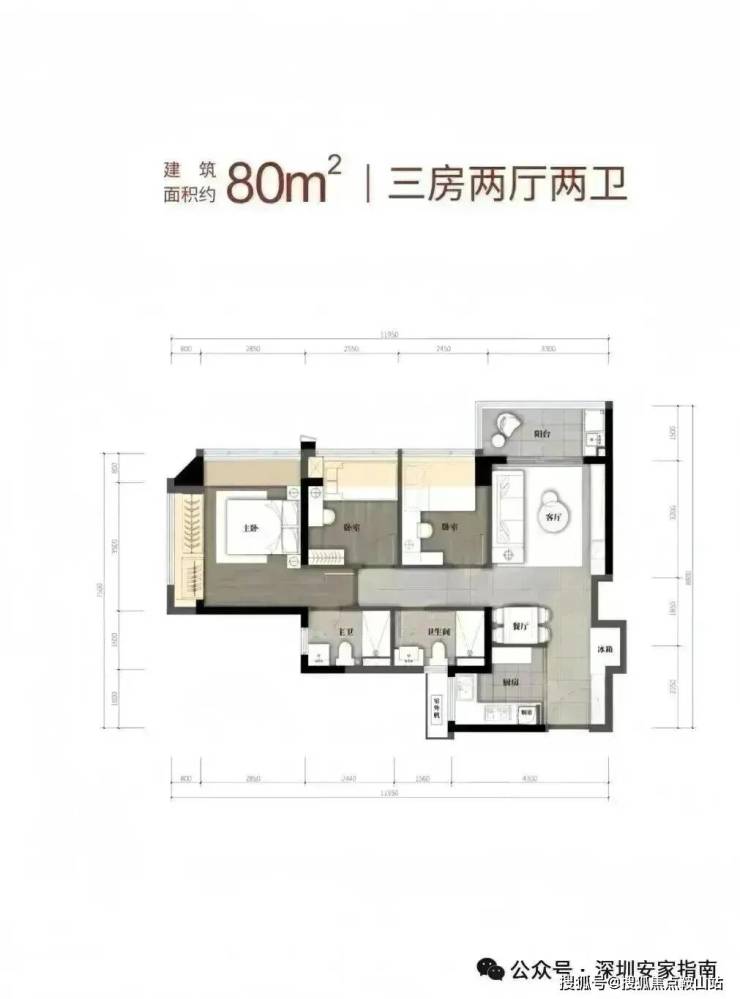 80m²的3房2厅2卫,折后总价298-322万/套,单价3.72-3.98万/m²。