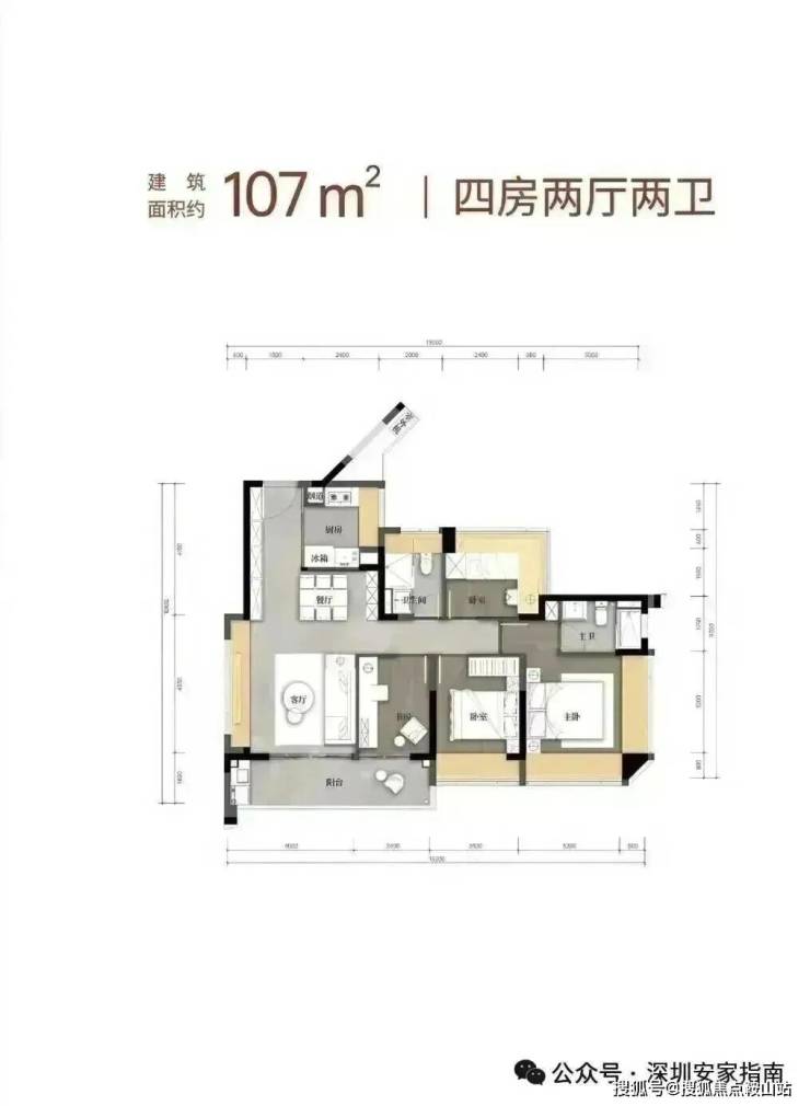 107m²的4房2厅2卫,折后总价429-465万/套,单价4.05-4.38万/m²。