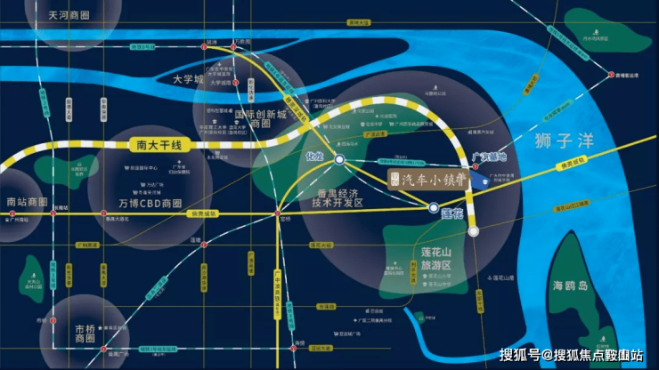 智联·汽车小镇项目位于番禺莲花湾板块,紧邻狮子洋,南望莲花山,自然景观可圈可点。