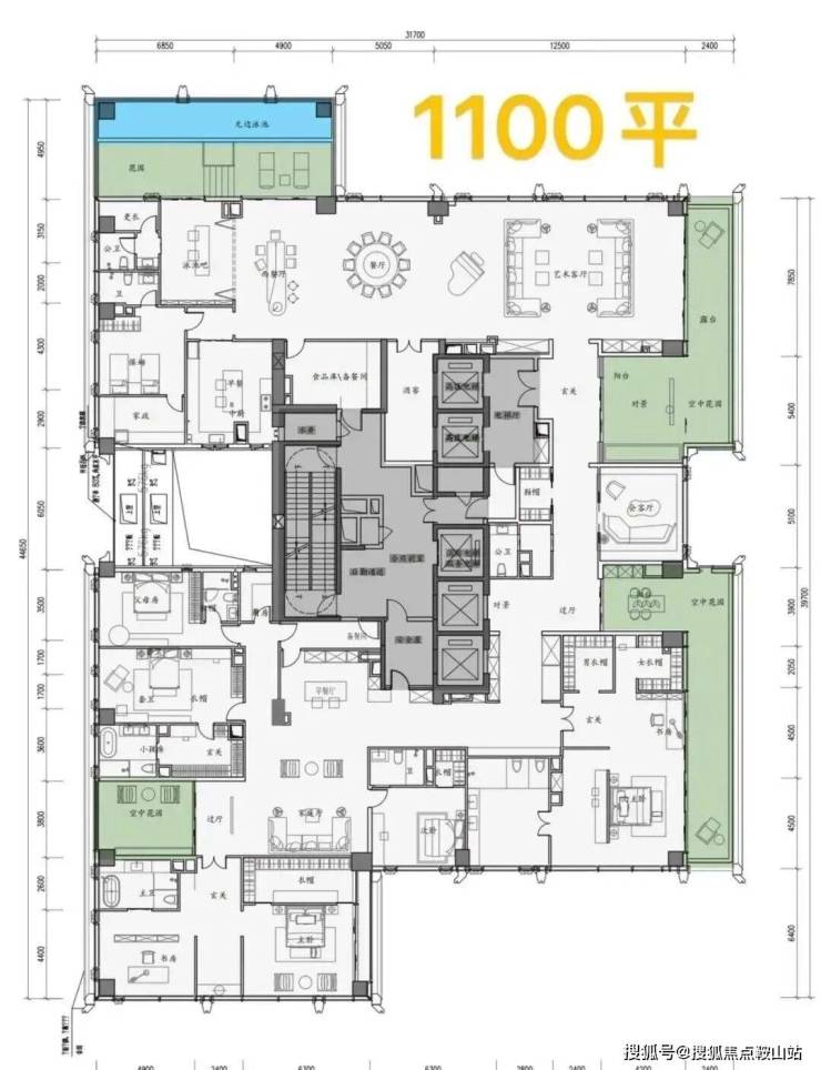 500㎡大平层, 客厅约10米进深、开间12.5米,阳台开间约12.5米,5房(4套房)