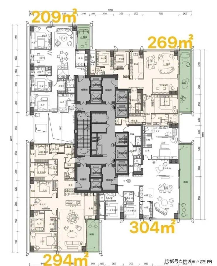 中低区(5-39F),约209-304㎡四房三卫