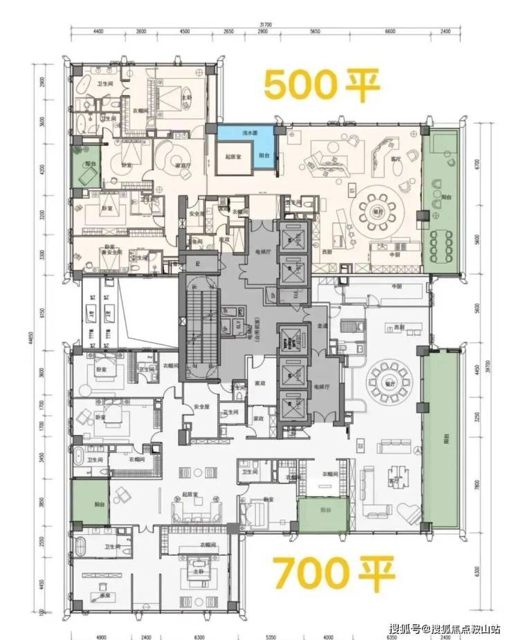 700㎡大平层,客厅约13.5米进深、开间约11米。阳台开间约15.5米,5房(4套房)