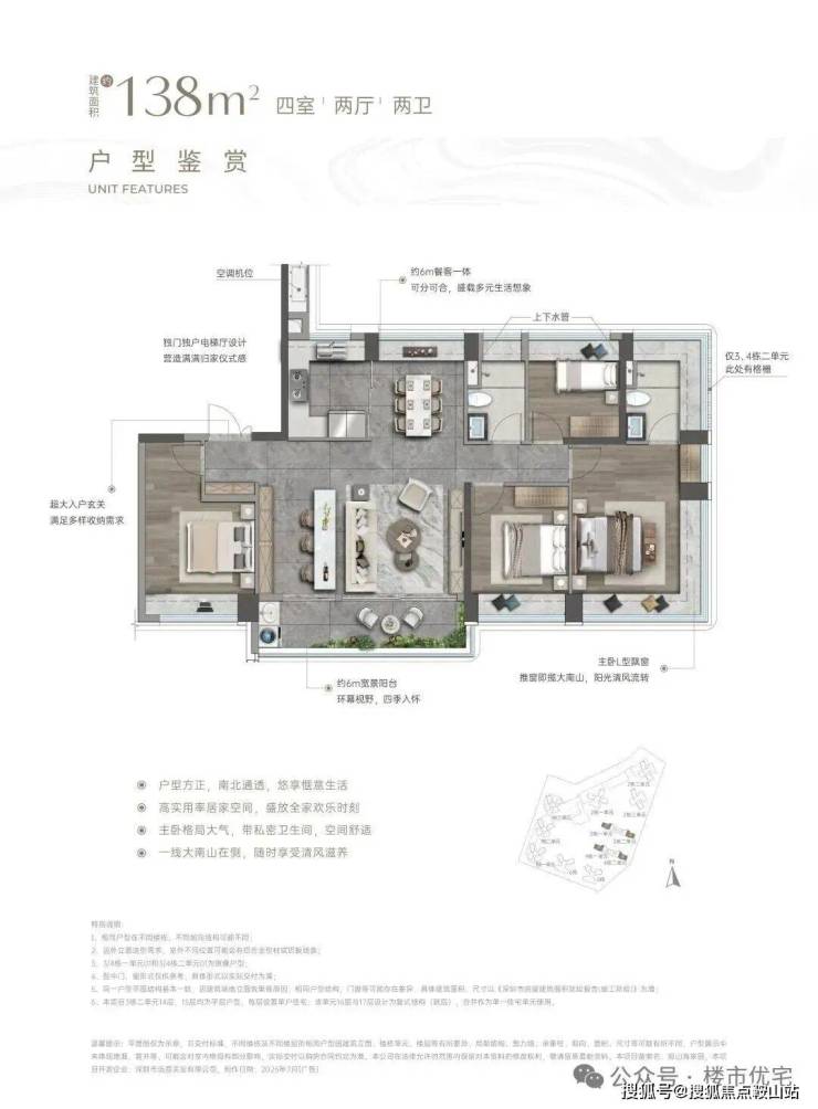该户型为西南向(部分户型看海)或东北向看山景,是传统的竖庭格局,南北通透。最大亮点是,阳台从客厅对出连通到次卧,显得比较宽敞。特别是对于三代同堂的家庭,适合老人早期锻炼。