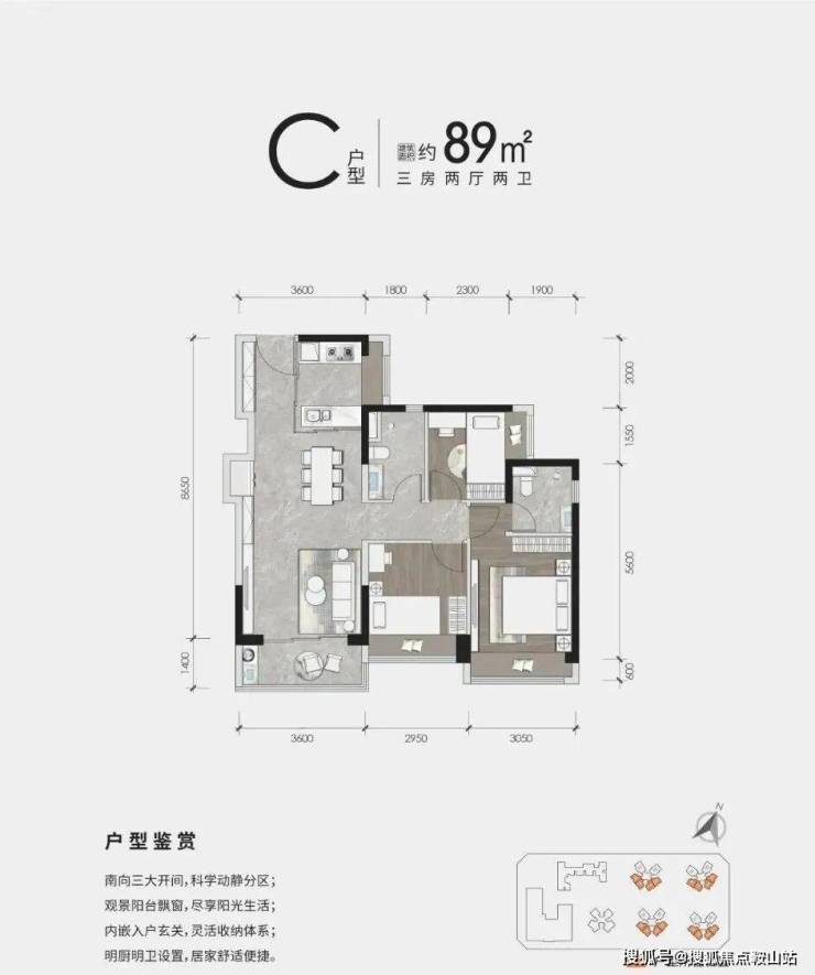 89㎡户型是传统的竖厅,动静分区,三房两厅一厨两卫一阳台的格局,找不出什么缺点,但还毫无亮点可言,A1和A2是对称的,除了玄关进来靠墙的位置有一个凸出的一块位置不一样外,其它部分是一模一样的。