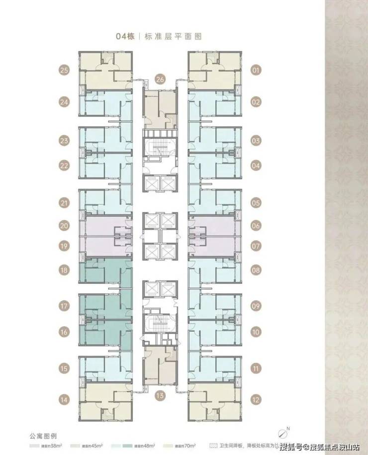 住宅由4栋48层建筑组成,分别是1栋、2栋1/2单元和3栋,3梯5/6户,4栋是商务公寓45F(1470户),5栋是幼儿园。