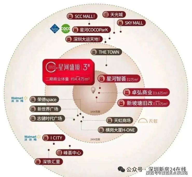 家门口超13万㎡商业(盛境约4.4万㎡,卓弘星辰约3.6万㎡(在建)、智荟约2万㎡),约2公里范围内覆盖30万㎡商业,繁华商圈拥簇,酣熟生活即刻兑现。5公里内更享百万平商业,星河COCOPark(龙岗山姆会员店)、SKY MALL、天光城等知名商业体环伺,尽揽都市繁华便利。