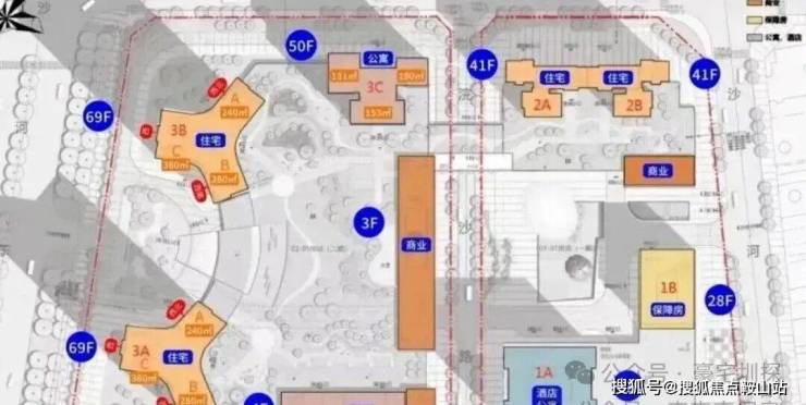 占地4.2万㎡,容积率6.63,分为两期不同地块。一期为1栋A座为150米高公寓+酒店、1栋B座为92米高保障房、2栋A/B座位为138米回迁住宅。