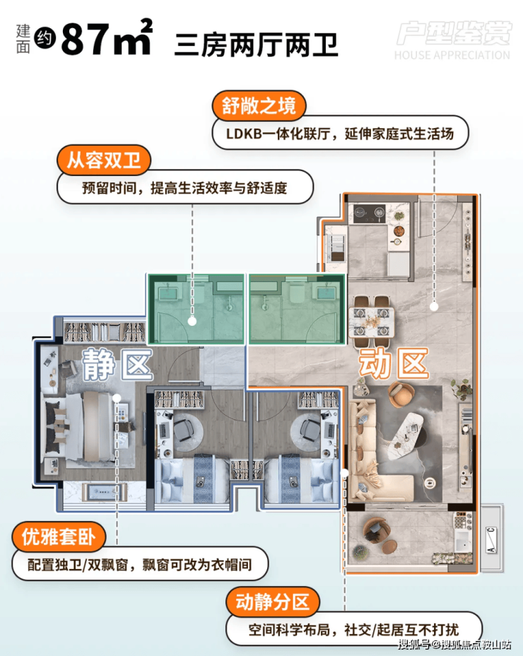 建面约87㎡户型以双卫设计,兼顾了家人居住便利度和主人居住的私密,是东莞市面上罕见的设计。