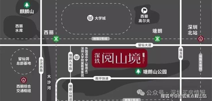 项目距离地铁5号线塘朗城地铁站A出入口约700米,主干道留仙大道、南坪快速,下面还有一条塘朗山隧道,五条主干道三面夹击。附近的西丽综合交通枢纽,也是由深铁集团投资建设。枢纽共规划13个站台25条线路,未来将引入赣深客专、深茂铁路、深汕铁路、深珠城际4条高铁,深惠城际、深莞增城际2条珠三角城际铁路,以及在建的13号线和规划中的15、27、29号线共4条地铁线路等。