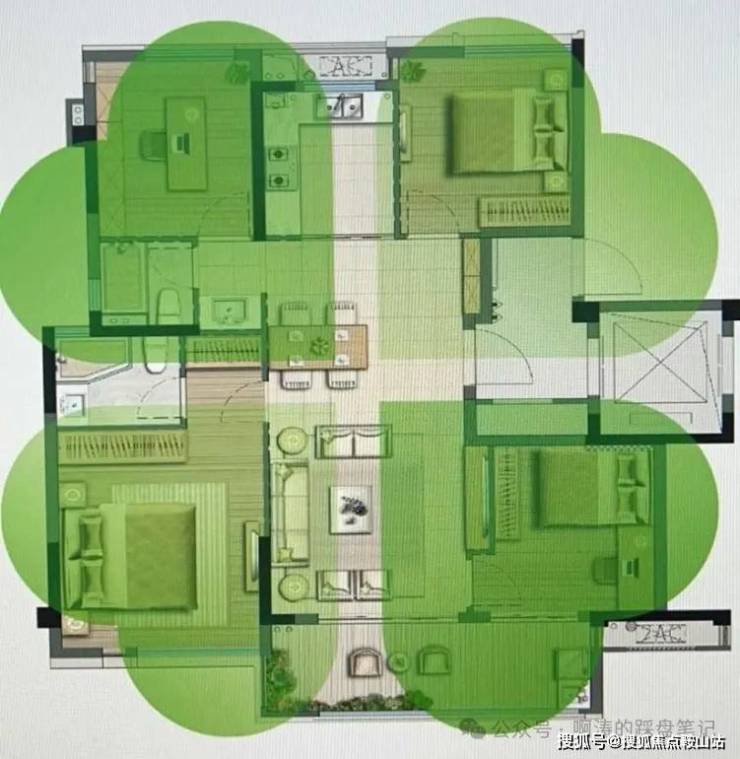 ·135平:餐客厅居中,四个卧室分布在四角,常规四叶草户型。
