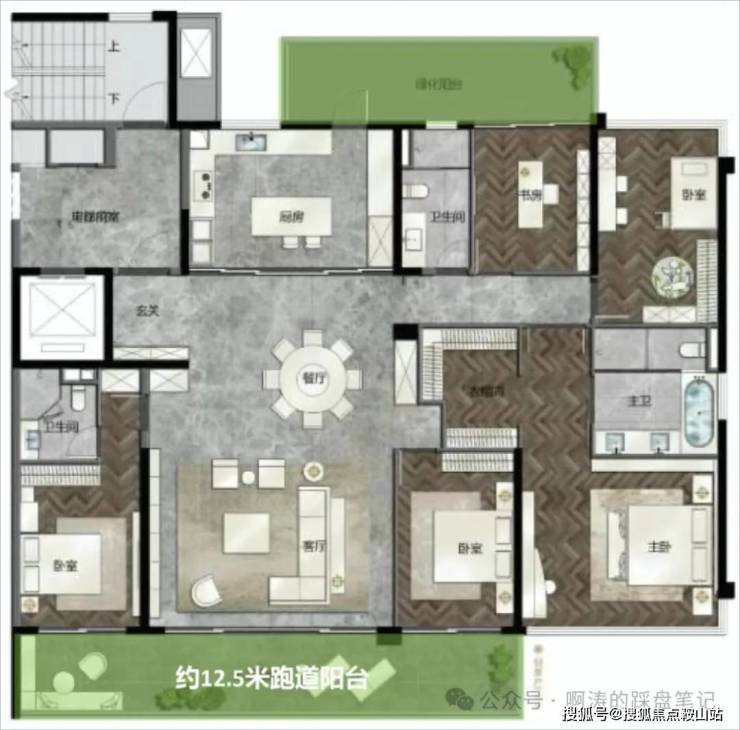 ·165平:常规飞机户型,双主套,南北双阳台,客厅、主卧都是南北对流,那个十字长中轴主卧,太气派!