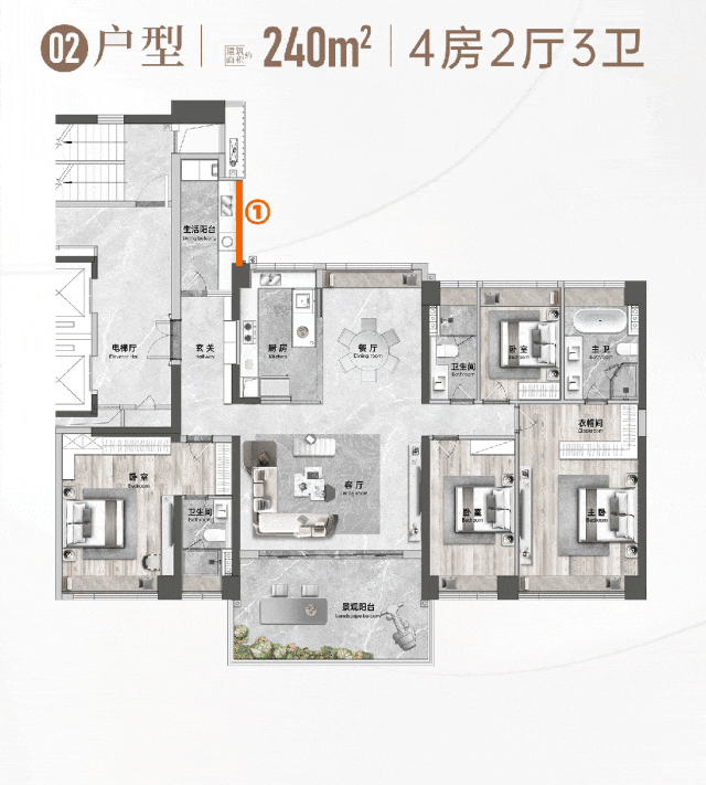 而且,客厅与景观阳台同宽相连,后期封窗,即可秒变环幕巨厅,给出了豪宅客厅应有的体面。