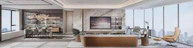 这个240㎡大平层,被打开的视角广度与纵深感,都是极限设计——约6.45米长、3.6米深、270°视野的IMAX级瞰景阳台。