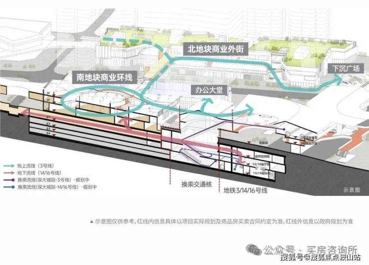 深铁阅云境广场,作为大运交通枢纽上盖物业,总占地面积约5.66万㎡,总建筑面积约51万㎡,以龙飞大道为界共分南北2期开发,有空中连廊相连,北区建设住宅小区,南区兼顾了公共性和便捷性,主要规划超高层办公写字楼和大型商业mall。
