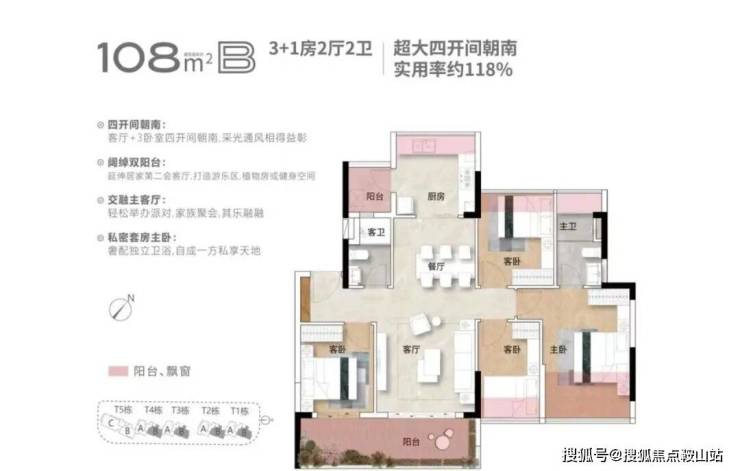 整个项目有5栋10层南向板楼,三个户型分别是98平、108平和156平,全四房设计。