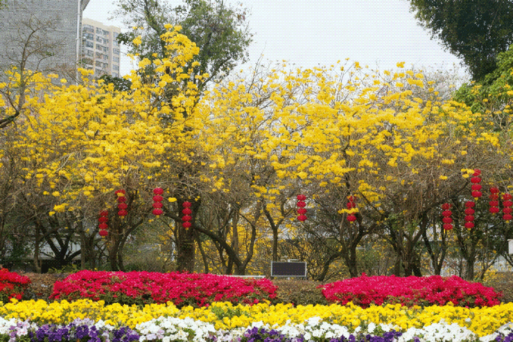 经过复绿改造,整个东广场,升级为复合型公共绿地空间,种植了黄花风铃木、异木棉等不同季节树种,确保广场四季有景可观。
