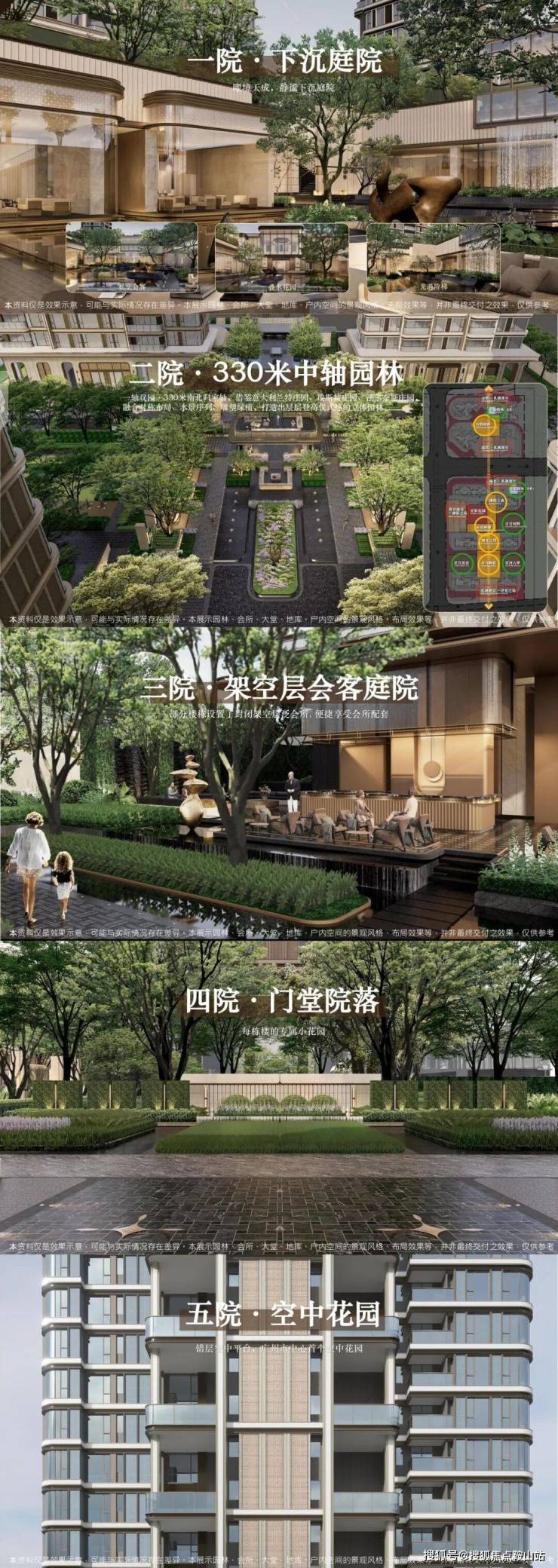 中央绿境:立体叠水园林,下沉式庭院,会所嵌入自然