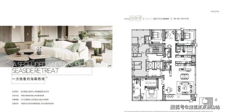【户型规划】由4栋51至63层3.6-3.9米层高的纯居住奢装交付地标、两栋4.5米层高的小高层,35栋独栋,全景幕墙、宽景阳台。