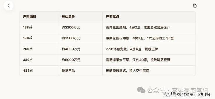 整体定位:纯大户型社区,新规设计,得房率/使用率近100%。户型区间:建面约 140–500㎡ 大平层及顶层复式。