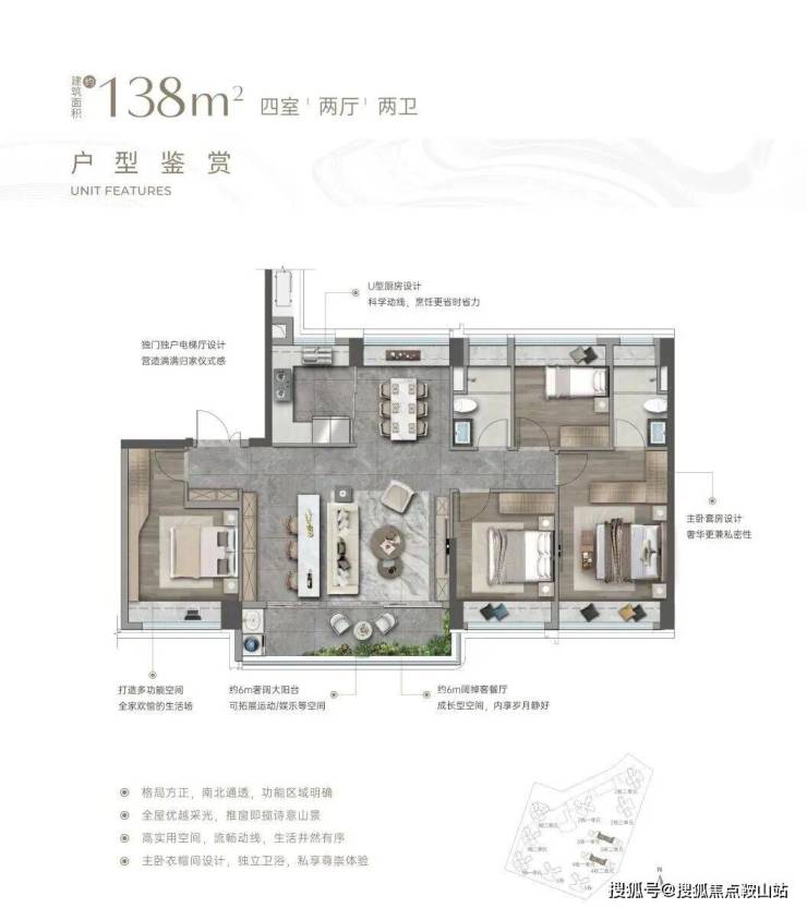 竖庭格局,西南向,基本居住功能与建面约108-110㎡4房2卫一致,但格局不一样,主卧空间有了更大的提升。