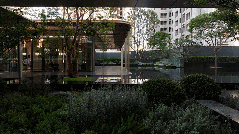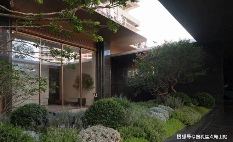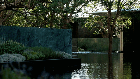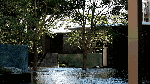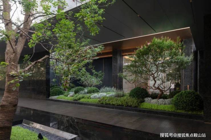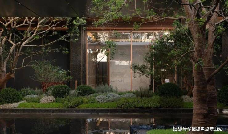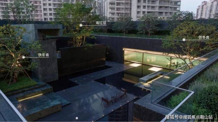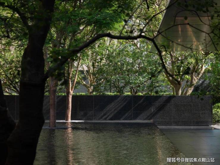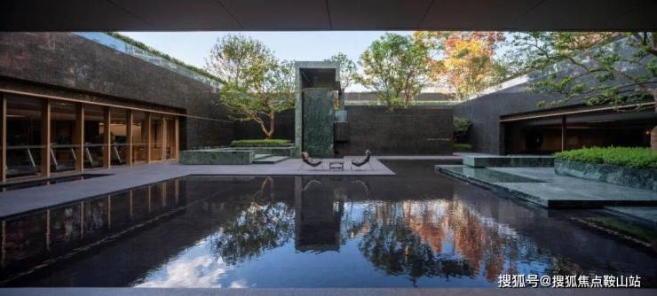 下沉式庭院延续极简有力的留白氛围,局部点缀海红豆、铁冬青,干净纯粹,营造少即是多的意境感,庭院如镜般平静、透彻的水景映出点点绿意。